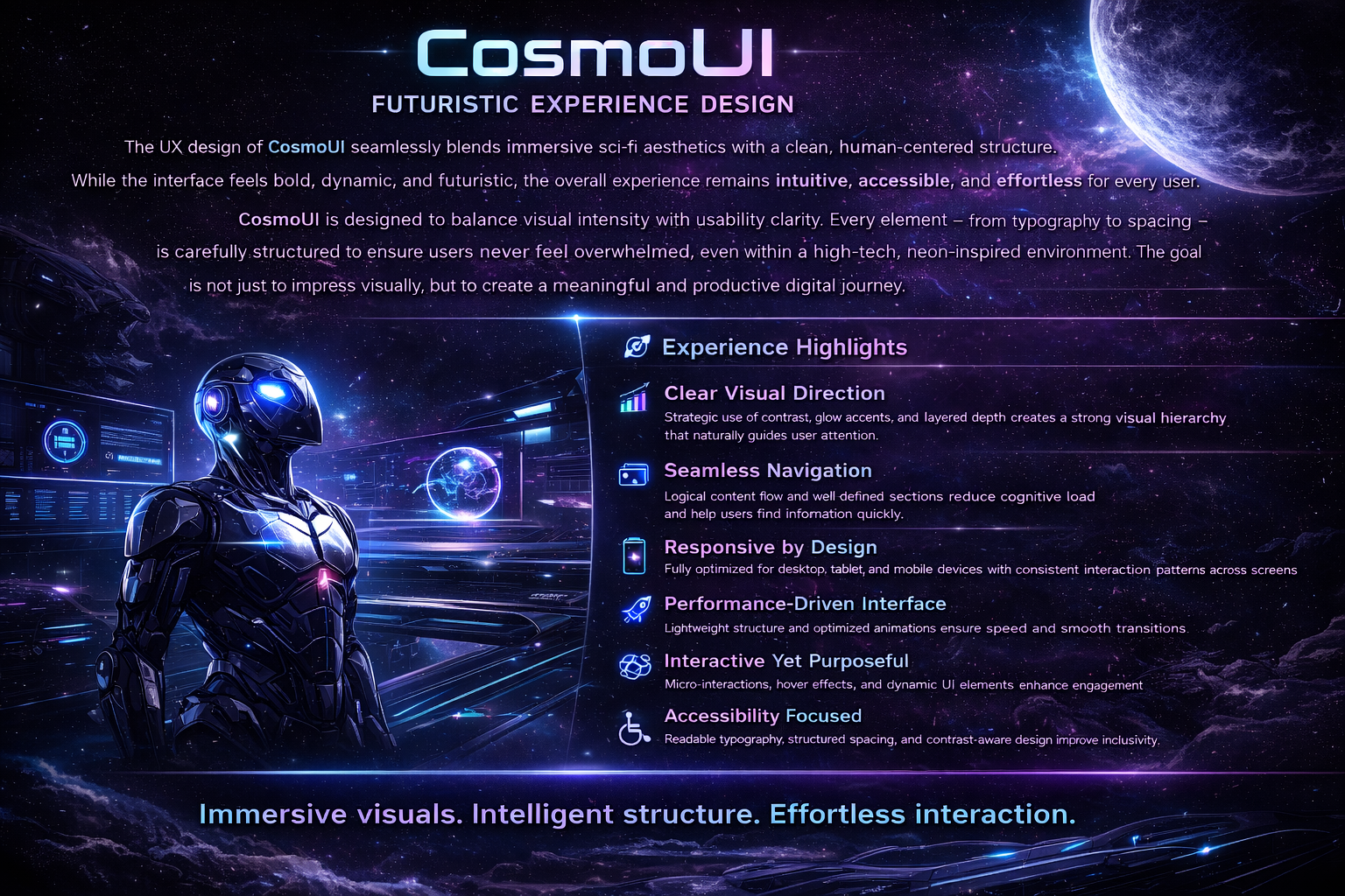 CosmoUI is designed to balance visual intensity with usability clarity. Every element—from typography to spacing—is carefully structured to ensure users never feel overwhelmed, even within a high-tech, neon-inspired environment. The goal is not just to impress visually, but to create a meaningful and productive digital journey.