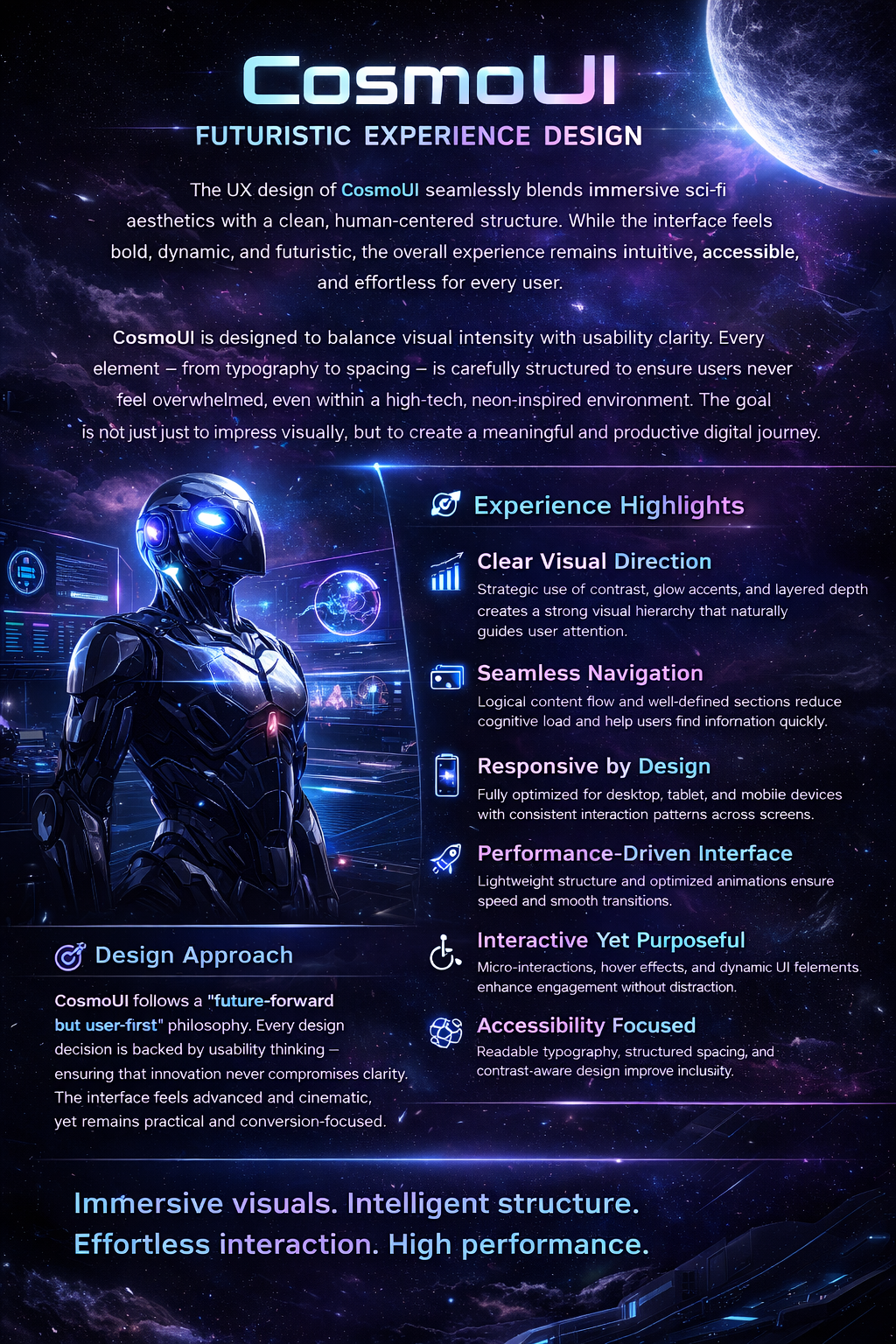CosmoUI follows a “future-forward but user-first” philosophy. Every design decision is backed by usability thinking—ensuring that innovation never compromises clarity. The interface feels advanced and cinematic, yet remains practical and conversion-focused.